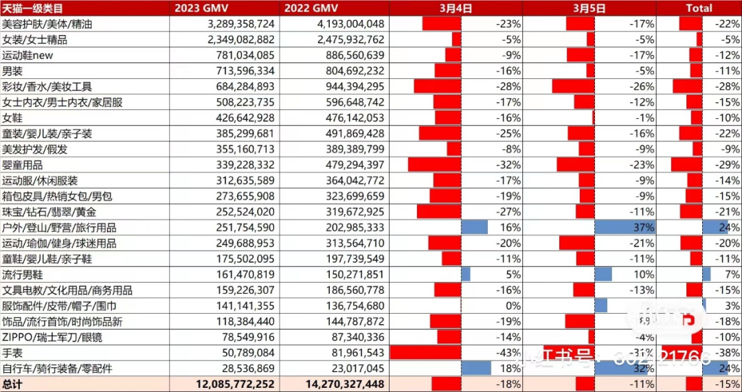 在疫情过后的消费复苏下,“三八大促”被寄予厚望,开年首促+春季上新+女性节日,三八节可谓是buff叠满。然而,据天猫发布的3月4日、5日的各品类销售数据显示,2023年相较于2022年的销售额整体呈现下滑趋势,仅户外登山用品、男鞋以及骑行配件三个品类实现正增长。