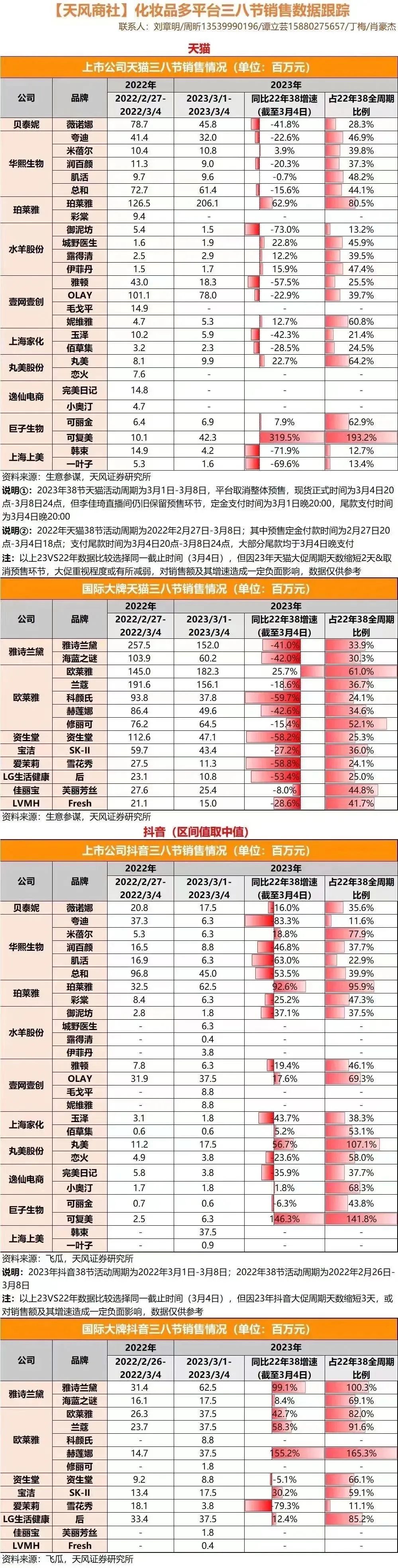 据天风证券就研究所数据显示,天猫三八节(2023.3.1-2023.3.4)预售期间,无论是雅诗兰黛、欧莱雅、宝洁,还是资生堂、爱茉莉、LG健康生活,国际美妆集团旗下品牌销售额均有下滑,尤其是欧莱雅集团,除了巴黎欧莱雅同比增长25.7%,兰蔻、科颜氏、赫莲娜、修丽可均呈现下滑态势,科颜氏下滑最厉害,同比下降为59.7%。此外,雪花秀同比下降58.8%,WHOO后同比下降53.4%,雅诗兰黛同比下降41%,海蓝之谜同比下降42%。