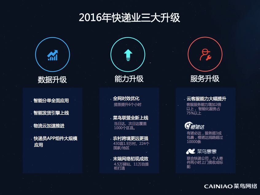 正是因为如上数据的提升,王文彬表示2016年对菜鸟来说是升级的一年。数据、能力、服务这三个方面是2016年不得不说的关键词。