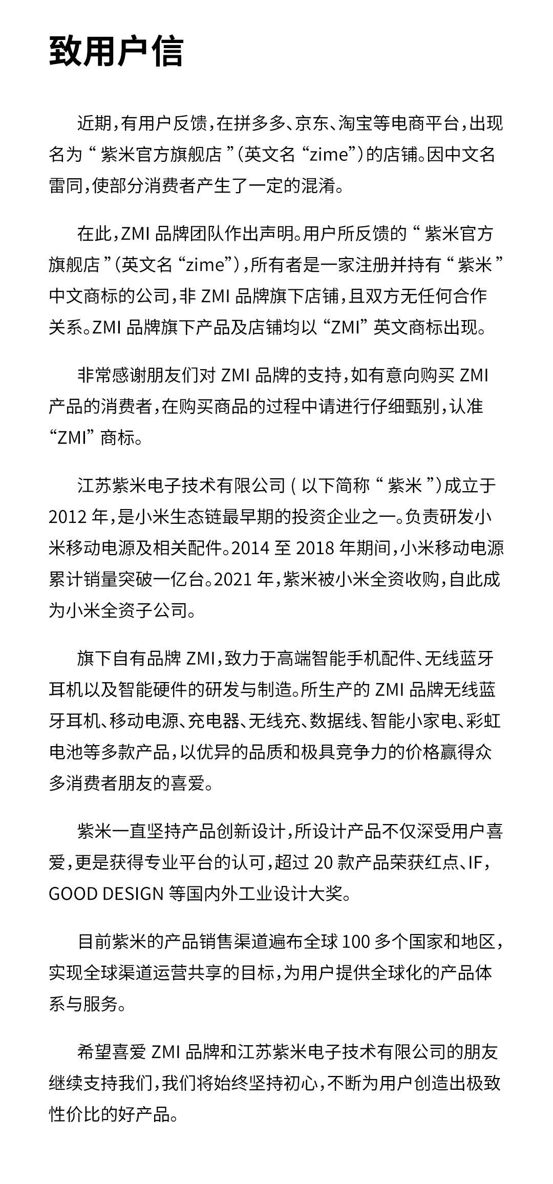 3月14日,小米旗下ZMI品牌团队发布声明称,近期,有用户反馈,在拼多多、京东、淘宝等电商平台,出现名为“紫米官方旗舰店”(英文名“zime”)的店铺。用户所反馈的“紫米官方旗舰店”(英文名“zime”),所有者是一家注册并持有“紫米”中文商标的公司,非ZMI品牌旗下店铺,且双方无任何合作关系。ZMI品牌旗下产品及店铺均以“ZMI”英文商标出现。