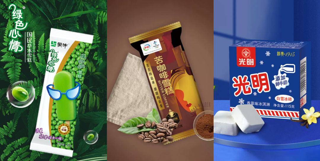 绿色心情、苦咖啡、光明冰砖等童年经典雪糕迎来增长,图片来源:蒙牛、伊利、光明