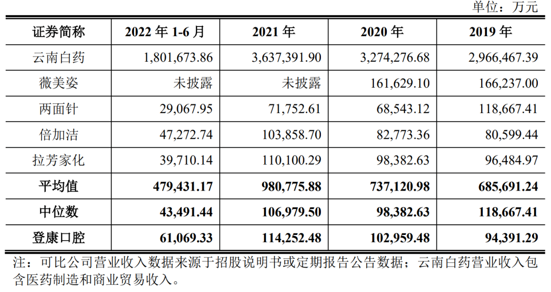 与同行可比公司相比,登康口腔的营收规模次于云南白药、薇美姿(对比维度为招股书所列企业),而高于两面针、倍加洁等。