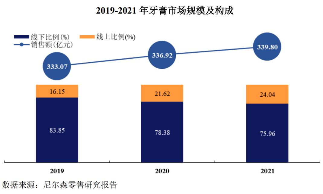 当前,牙膏市场依然以线下渠道为主。尼尔森零售研究报告显示,2019年至2021年,线下渠道占比始终超过75%。