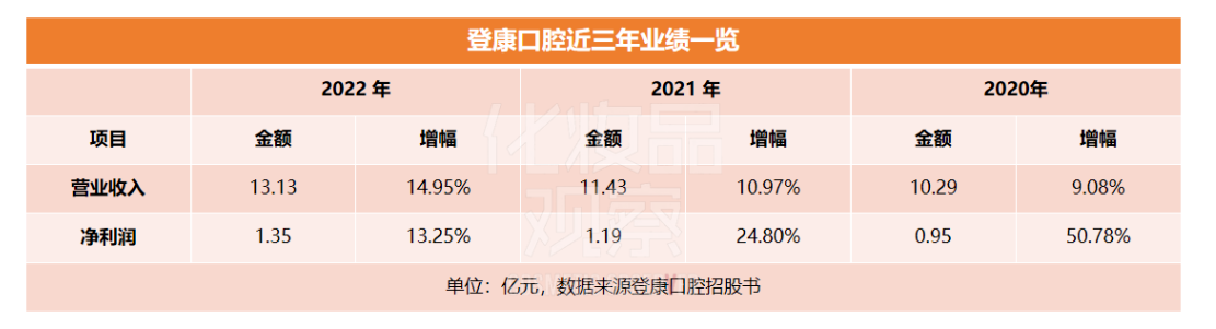 从营收来看,2020年至2022年,登康口腔的复合增长率超过10%,其中2022年增幅最高,达到14.95%,规模突破13亿元。