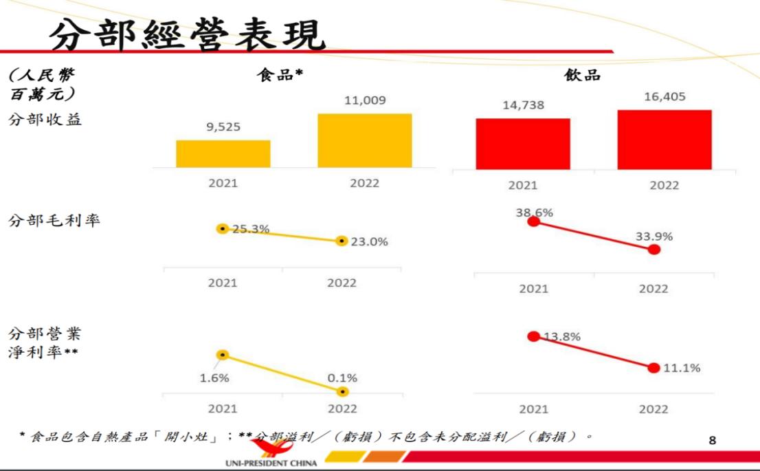 统一企业中国的另一大业务板块为饮品板块,其饮品业务2022年收益为164.05亿元,同比增长11.3%;录得应占溢利为18.29亿元,同比下降9%。