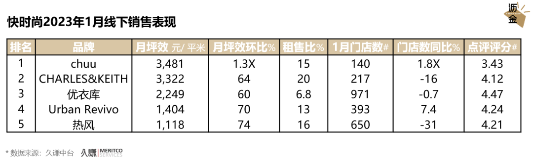 韩国快时尚品牌chuu可谓是一匹黑马,保持着坪效领先与高速拓店,坪效环比提升幅度较大。