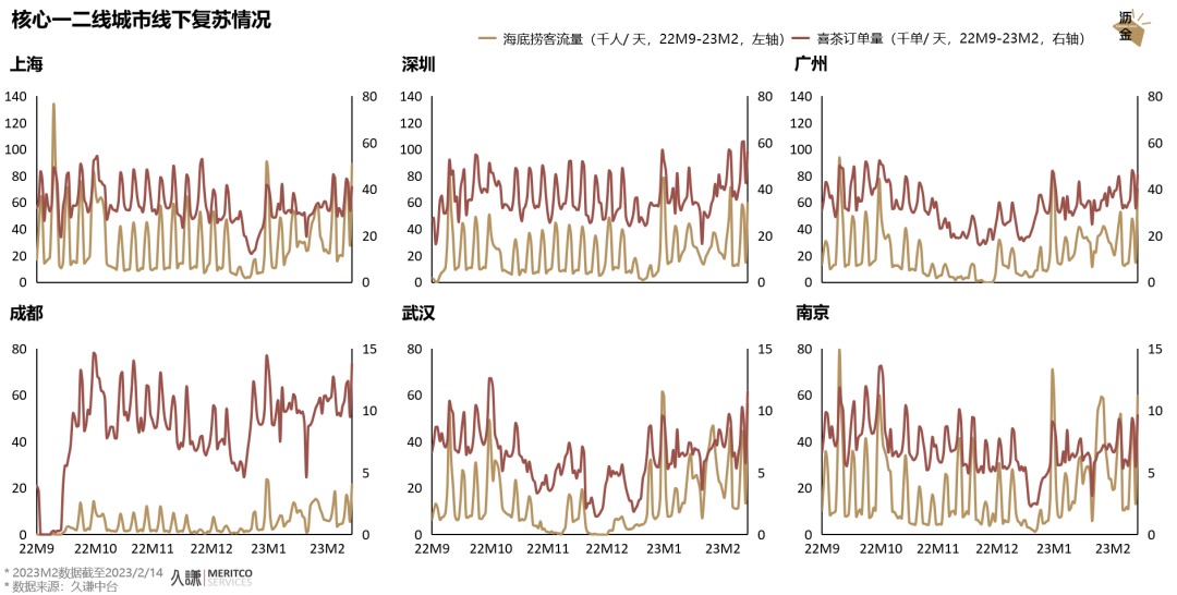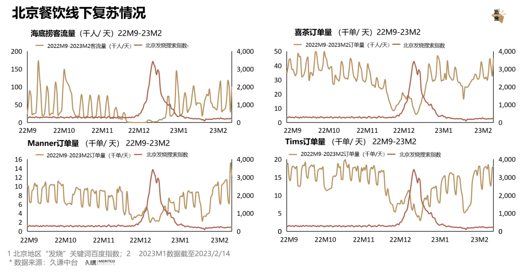而北京的海底捞、喜茶、Tims和Manner四个品牌的日订单量,也恢复至去年12月防疫政策放开前的消费水平。