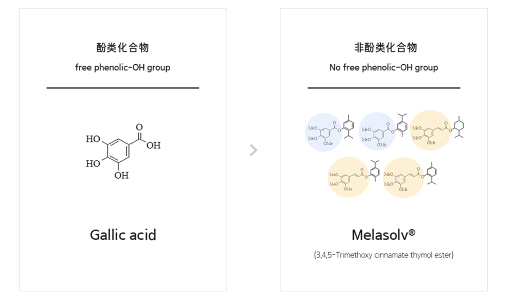 在不同的美白通路中,直接阻断在黑色素生成中发挥关键作用的酪氨酸酶是最有效的方法之一,酚类化合物更是因为具备这种特性而被广泛用作美白剂。然而,曾有报道表明,酚类化合物可能具备引发白癜风的安全隐患。因此,爱茉莉太平洋认为,需要开发一种美白机制更安全的美白剂。