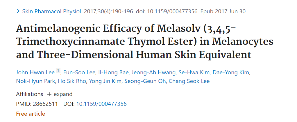 [1] Lee JH, Lee ES, Bae IH, et al. Antimelanogenic Efficacy of Melasolv (3,4,5-Trimethoxycinnamate Thymol Ester) in Melanocytes and Three-Dimensional Human Skin Equivalent. Skin Pharmacol Physiol. 2017;30(4):190-196.