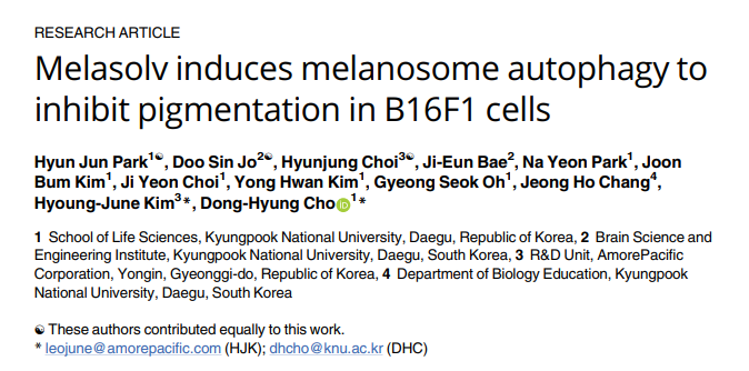 [2] Park HJ, Jo DS, Choi H, et al. Melasolv induces melanosome autophagy to inhibit pigmentation in B16F1 cells. PLoS One. 2020.