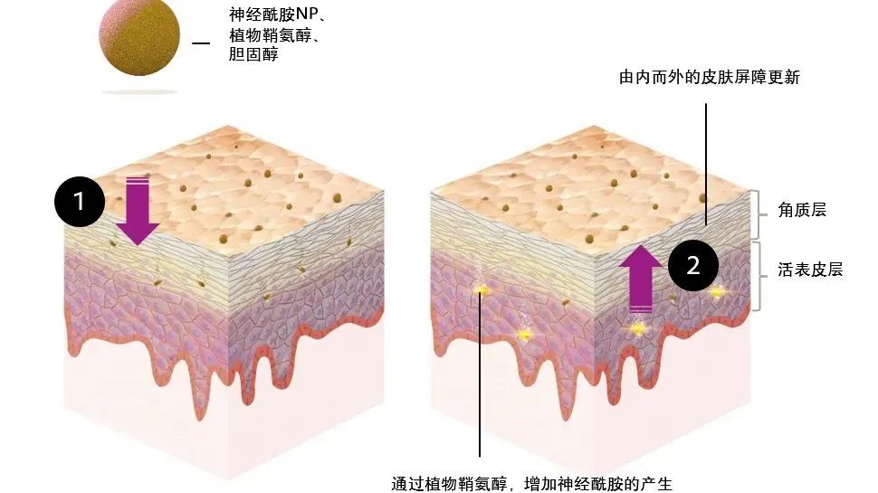 该产品借助天然来源的脂质材料,将神经酰胺NP、植物鞘氨醇和植物来源胆固醇的复合物包裹起来,经皮肤屏障传导至更深的活性表皮层,在增加皮肤自身脂质储备的同时,促进多种神经酰胺的合成,从而提升皮肤的屏障功能,缓解衰老迹象。
