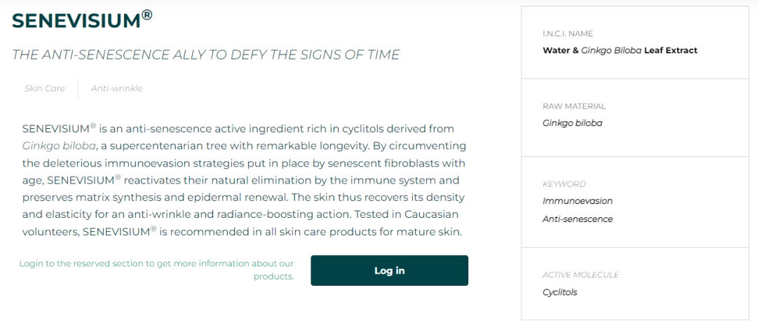 银杏被列为“长寿树”的成员之一,其“寿命”平均可达到千岁以上。受到银杏强盛的生命力以及其抵御自然灾害能力的启发,SILAB通过研究银杏的植物免疫系统,从银杏叶中提取得到了富含环醇的SENEVISIUM (INCI:水、银杏叶提取物),并发现该成分具备特殊的抗衰老作用机理。