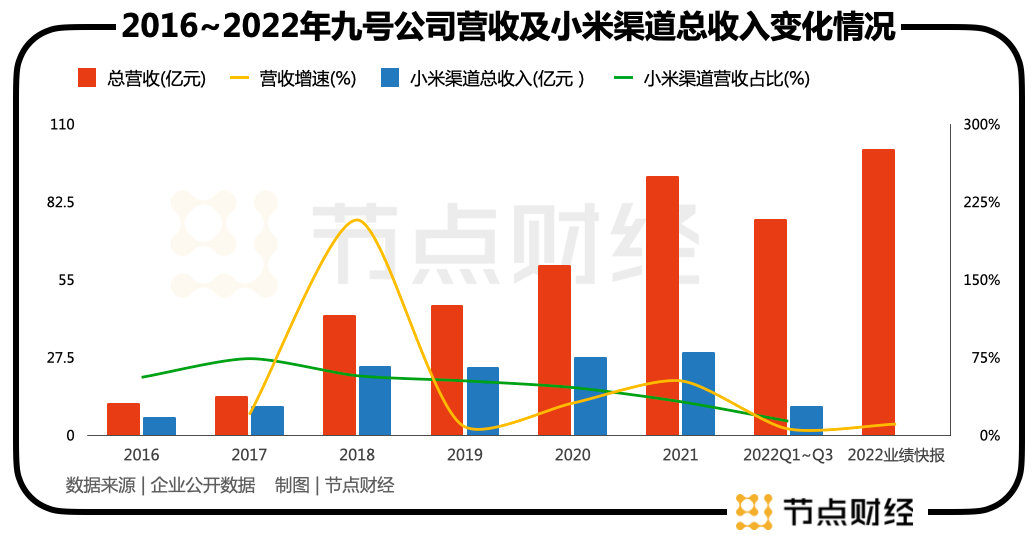 回顾九号公司近七年的发展,2016~2022年,九号公司营业收入从11.53亿元增至101.2亿元。去年营收滑坡背后,九号公司从小米渠道获得的收入比例在持续下降,从2017年超过七成(73.76%)不断减少,直到降至2022Q3的13.46%。