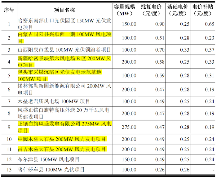 截至2022年12月公司已完成并网的容量规模在100MW及以上的10个项目中,6个项目均受到可再生能源补贴核查影响。图中第2、4项风电项目电价补贴预计降低0.02元/度,第5项光伏发电项目电价补贴预计降低0.19元/度,而第9、10、11项电价项目预计可能被取消电价补贴。