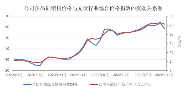 2021年,公司多晶硅销量为74668.67吨,与2020年74715.35吨基本持平,但多晶硅价格相比2020年上涨158.28%。2022年公司多晶硅销量同比上涨42.92%,同时多晶硅价格继续上涨,同比上涨58.02%。