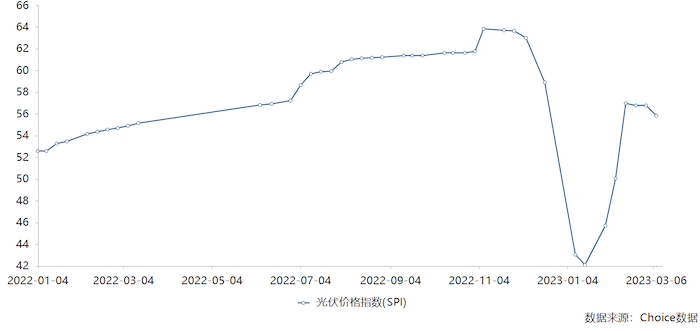 choice数据库显示,2023年1月光伏价格指数(SPI)一度下挫,2023年1月16日下滑至最低点42.1后回弹,截至2023年3月6日的SPI为55.8,较前一周小幅下滑。