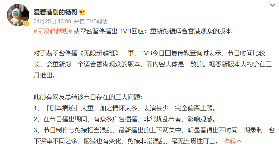 不难看出,围绕《无限超越班》的差评,大都是围绕制作人以及背后的平台方,但节目并非一无是处,单就商业价值而言,拥有君乐宝优萃有机奶粉、三星、上汽大众、胡姬花古法花生油以及连花清瘟胶囊等多个品牌赞助的《无限超越班》,此番为TVB所累积的社会关注度与商业价值,为后续在内地掘金有了更多可讲的平台故事。