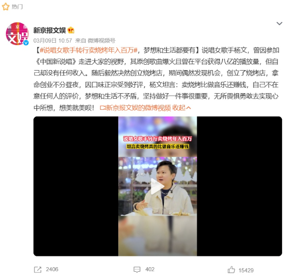 近日,新京报文娱发布的一则视频火了,一位叫杨文的年轻女孩在镜头前称自己曾当过说唱女歌手,后来在英国读研期间转行改卖烧烤,没过多久就年入百万。