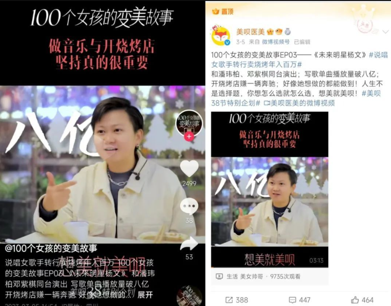 有细心的网友发现,“说唱女歌手转行卖烧烤年入百万”这条视频首发是在抖音账号“100个女孩的变美故事”上,该账号背后的主体是一家互联网美业公司,该公司的微博在同一天也曾转发了这则视频,并显示这一系列视频为其38节特别企划。而杨文自己在视频中也提到过,自己下一步计划是进入职场,目前已经在一家互联网美业公司当管培生。