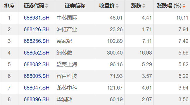 其中,涨幅较高的公司有:中芯国际(688981.SH)涨10.11%、沪硅产业(688126.SH)涨7.94%、寒武纪(688256.SH)涨7.42%、纳芯微(688052.SH)涨5.99%、盛美上海(688082.SH)涨5.82%。