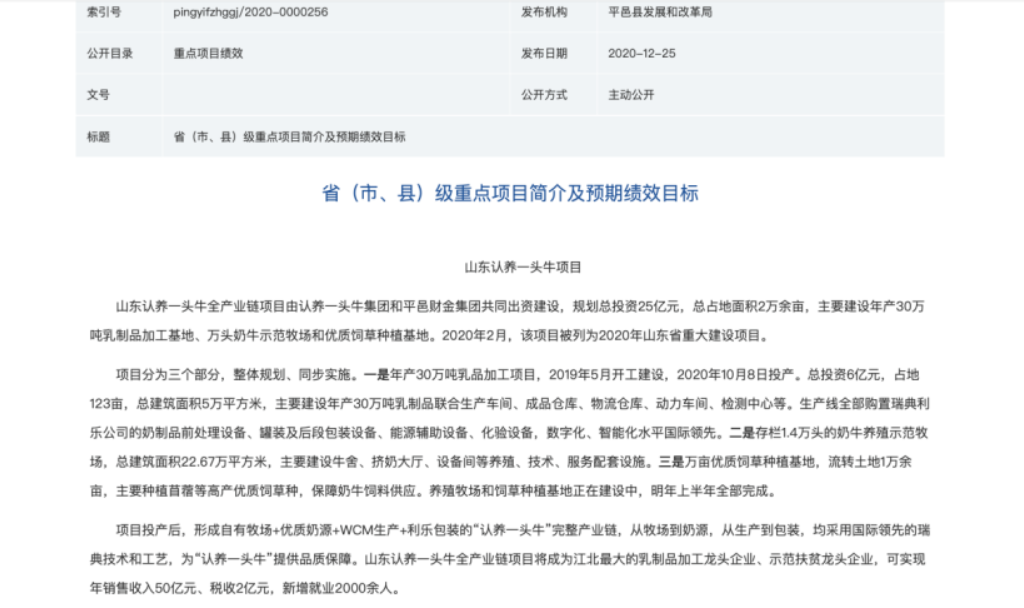 在2020年10月,认养一头牛在举行上述年产30万吨乳品加工项目的同时,也举办了上述万头奶牛示范牧场项目的奠基开工仪式,也就是说,上述被认养一头牛称为竣工的“平邑益农项目”或仅是上述山东项目第一期——“年产30万吨乳品加工项目”。