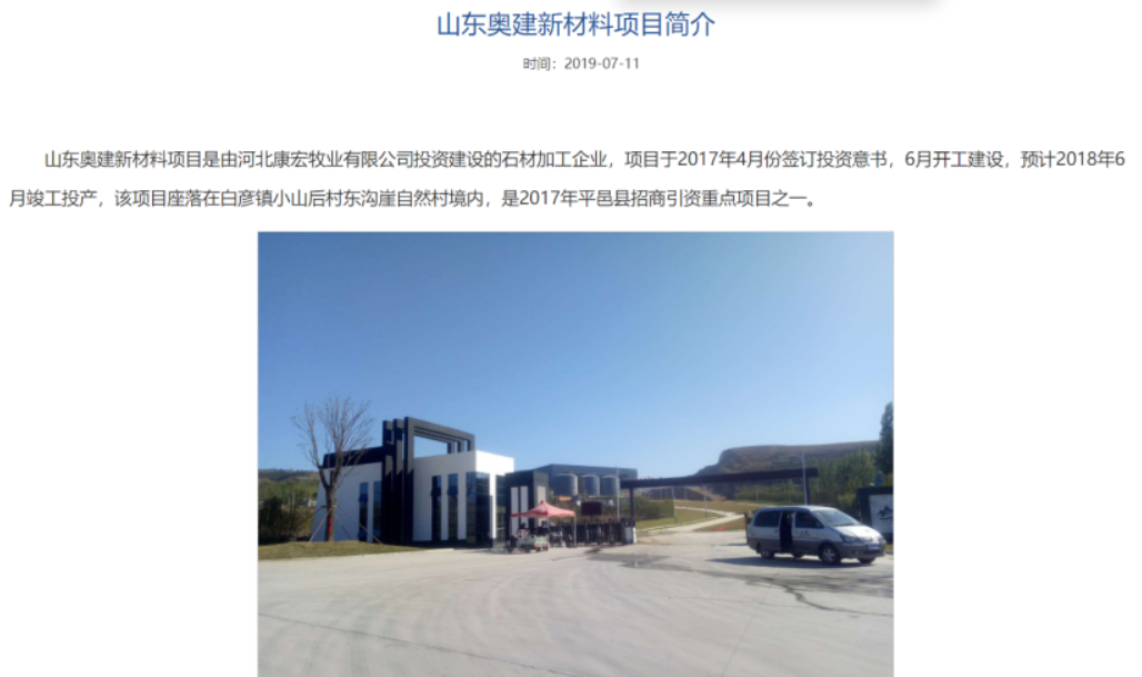 据当地政府2019年官方发布的公告显示,一个名为“山东奥建新材料项目”由河北康宏牧业有限公司(下称“河北康宏”)投资建设,该项目为的石材加工,项目于2017年4月份签订投资意书,6月开工建设,预计2018年6月竣工投产;