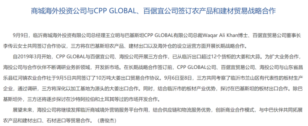 其中临沂商城海投由临沂商城控股集团有限公司(隶属临沂市人民政府国有资产监督管理委员会)以及天元建设集团有限公司(天元建业投资控股有限公司旗下)分别持股51%、49%,主要从事海外项目投资业务;在2019年的一篇报道中,临沂商城海投曾称将与中巴伙伴共同拓展农产品和建材出口、石材进口等贸易合作;