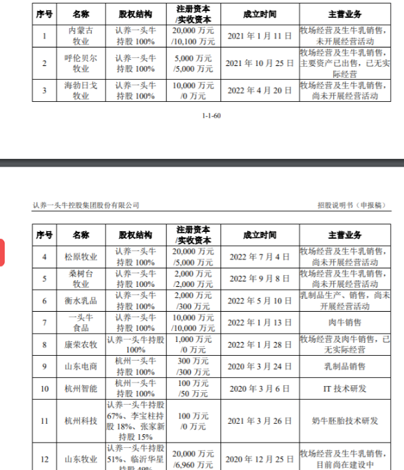 据最新招股书,在建立山东生产基地后,认养一头牛又设立了呼伦贝尔内蒙古牧业、海勃日戈牧业(此次IPO募投项目)、松原牧业等子公司经营自有牧场;不过截至最新招股书签署日,上述自有牧场多未展开经营。