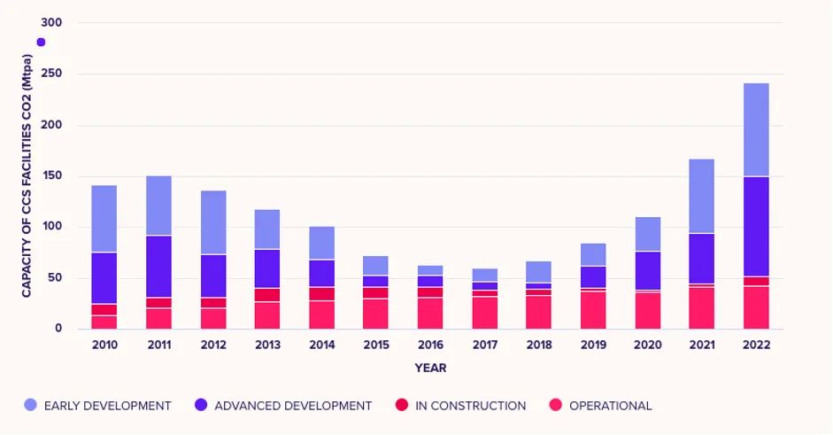 - 2022年,所有在建的碳捕集与封存技术项目总处理量为每年2.44亿吨二氧化碳。