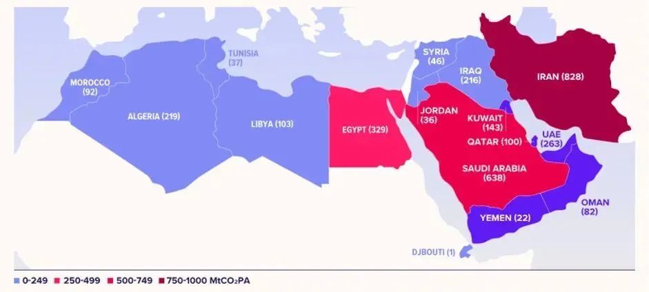 卡塔尔、科威特、阿联酋、巴林、沙特等国位列人均碳排放前十国家。因此,中东、北非被视为温室气体排放最为严重的地区。