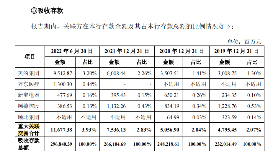 基于顺德农商行在顺德地区广泛的营业网点布局,截至2022年6月30日,顺德区在该行的存款占比达76.24%。其中,大股东美的集团贡献存款95亿元,占关联方存款总额的3.2%。