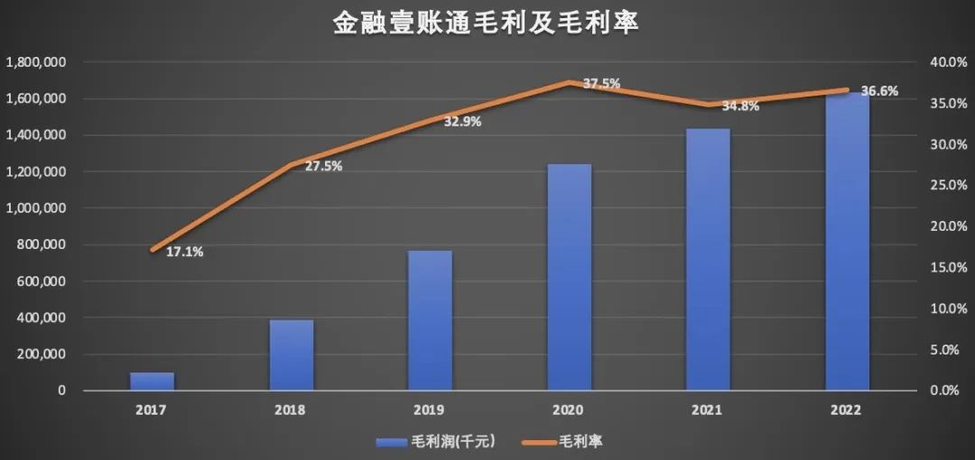 年报显示,2022年金融壹账通的毛利润为16.4亿元,同比增长13.8%,毛利率同比上升1.8个百分点至36.6%。