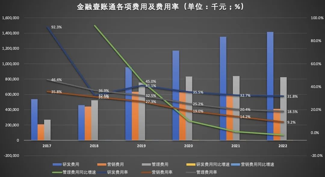 2022年,金融壹账通营销费用和行政管理费用均有不同程度的削减,其中营销费用大幅削减,该项费用同比减少30.1%至4.11亿元,营销费用率从2021年的14.2%,下降至2022年的9.2%;行政管理费用同比减少2%至8.25亿元,管理费用率从2021年的20.4%,下降至2022年18.5%;作为一家金融科技公司,研发费用需要长期稳定的投入,金融壹账通在研发方面的投入也在“克制”,2022年研发费用仅同比增长4.8%,研发费用率从2021年的32.7%,降至2022年的31.8%。