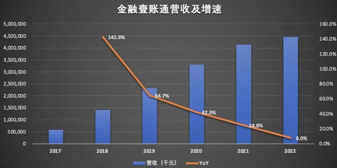 数据显示,2022年金融壹账通实现44.64亿元的营业收入,同比增速仅8%,这一增速低于2020年的42.3%,以及2021年的24.8%。