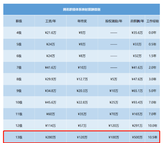 在新的职级体系下,员工的职级被划分为4级至17级,因此此次被裁的黄希彤,其T13级的职级已处于公司内部很高的级别,相当于旧职级体系中的4.2级,大致和阿里的P9级相当。若按网上流传的帖子对照(未经官方证实),即便不包含股权激励和年终奖在内,13级别的员工仅工资就在280万元/年的水准。