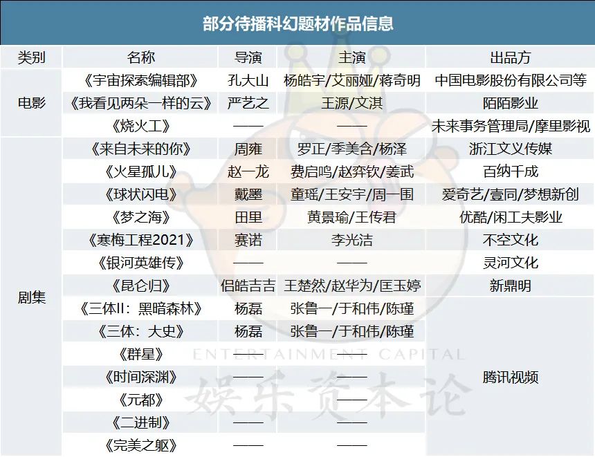 2017年到2019年这段时间,对影视行业来说是热钱逐步往外走的两年,整个行业都在埋头做事。直到2019年年初,《流浪地球》和《疯狂的外星人》两部科幻电影上映,又一个拐点到来了。随着这两部电影上映带来的热度,各大公司一定程度上增加了科幻储备,但是后续上映的《上海堡垒》等作品,又迅速令市场对科幻持怀疑态度。疫情更是直接打断了这股科幻热潮。
