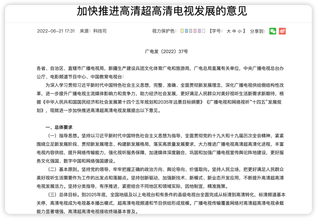 在政策上,2022年6月,总局《关于进一步加快推进高清超高清电视发展的意见》政策出台,提出了发展目标与要求:到2025年,基本实现超高清电视的规模化发展与终端普及。在此之后,各地方广电播出机构便开始积极推进全高清化播出、4K超高清制播能力建设等工作。