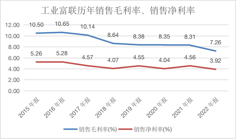 2022年,工业富联销售毛利率为7.26%,销售净利率也仅为3.92%,分别下滑1.05个百分点、0.64个百分点。公司毛利率已连续6年下滑,且下滑幅度有所扩大。