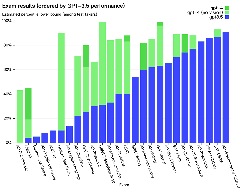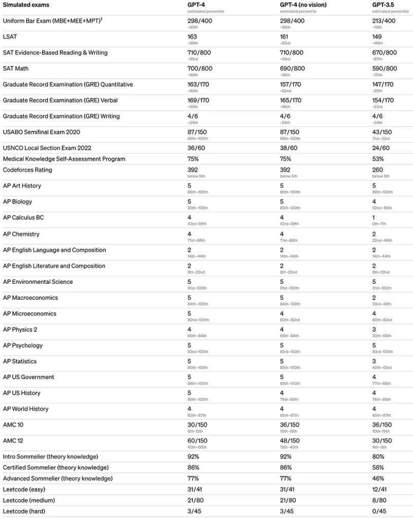 为了了解这两种模型之间的区别,OpenAI在各种基准测试中进行了测试,包括最初为人类设计的模拟考试。他们使用了最新的公开试题(在奥林匹克竞赛和AP自由答题的情况下)或购买 2022-2023年版的模拟考试题。