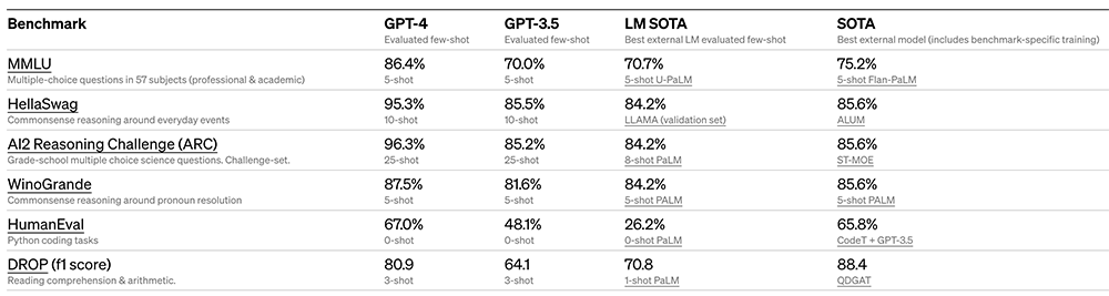 OpenAI还在为机器学习模型设计的传统基准测试中评估了GPT-4。GPT-4大大优于现有的大型语言模型以及大多数最先进的(SOTA)模型,其中可能包括基准特定的制作或额外的训练协议: