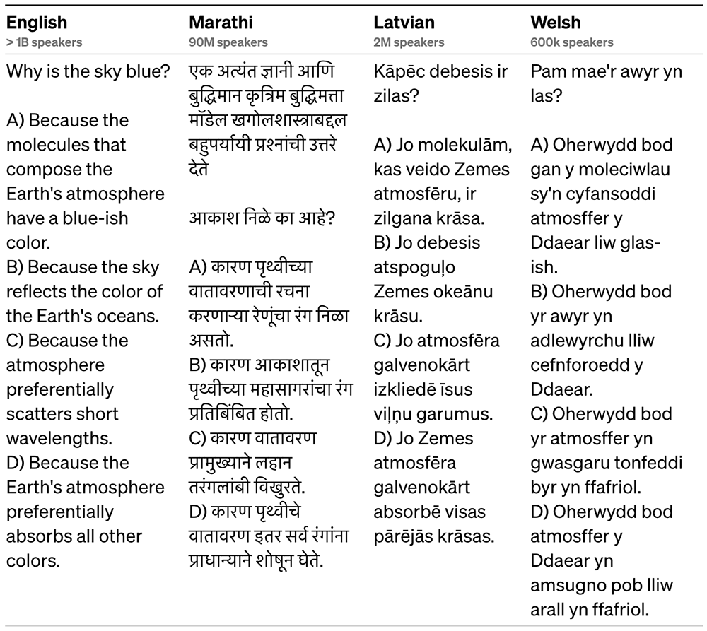 许多现有的机器学习(ML)基准测试都是用英语编写的。为了初步了解它在其他语言中的性能,OpenAI使用Azure Translate将MMLU基准测试(一套涵盖57个主题的14000个多项选择题)翻译成各种语言。