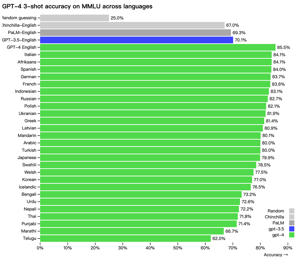 在测试的26种语言中的24种中,GPT-4优于GPT-3.5和其他大型语言模型(Chinchilla,PaLM)的英语表现,包括拉脱维亚语、威尔士语、斯瓦希里语等资源匮乏的语言。
