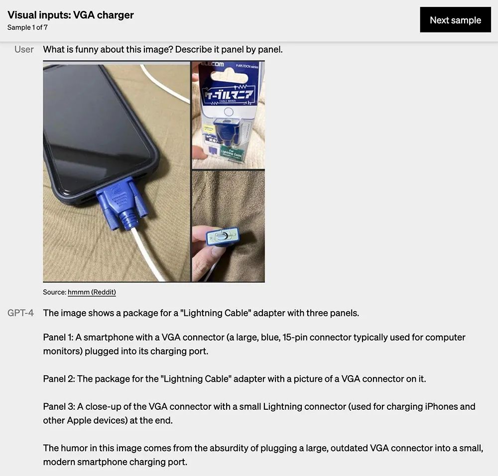 输入一张由三张图片拼成的图,用户输入“这张图有什么奇怪的地方?一张图一张图地描述”,GPT-4会分别对每张图中的内容进行描述,并指出这幅图把一个大而过时的VGA接口插入一个小而现代的智能手机充电端口是荒谬的。
