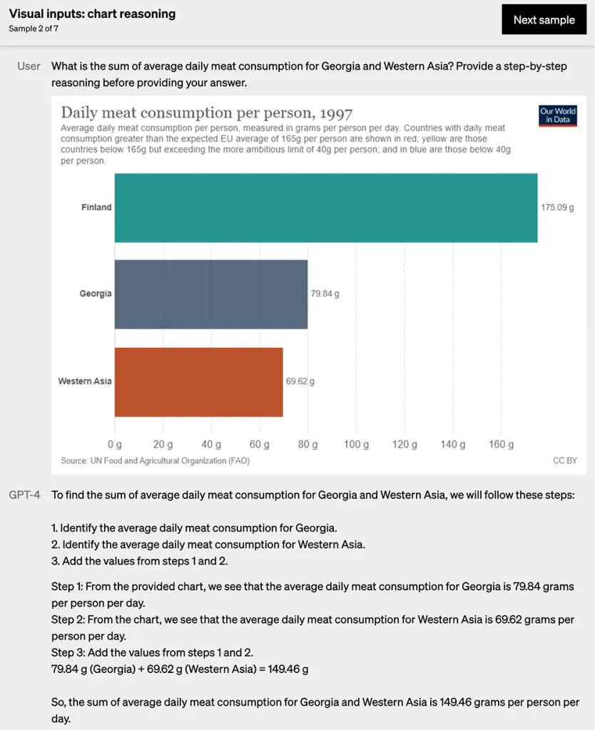 用户问格鲁吉亚和西亚的平均每日肉类消费量总和是多少,让GPT-4在给答案前提供一个循序渐进的推理,GPT-4也能按需作答。