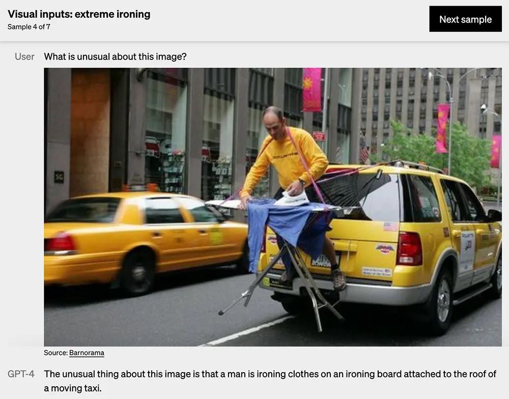 用户问“这张图片有什么不寻常之处”时,GPT-4简练地回答出“一名男子正在行驶中的出租车车顶上在熨衣板上熨烫衣服”。