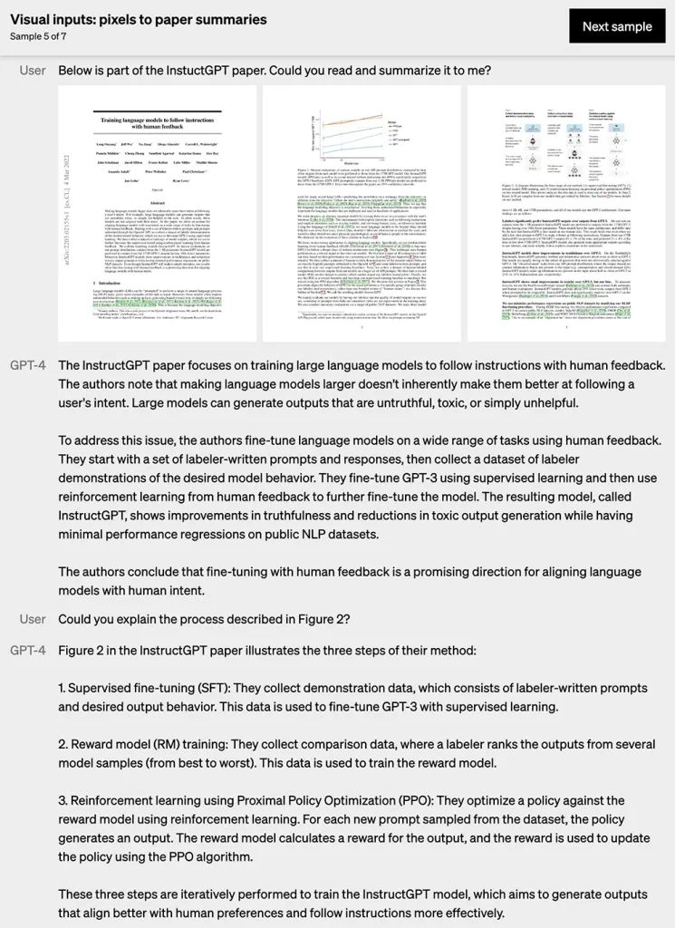 给几张论文的照片,GPT-4可以做总结,也可以对用户指定的图片的内容进行展开解释。