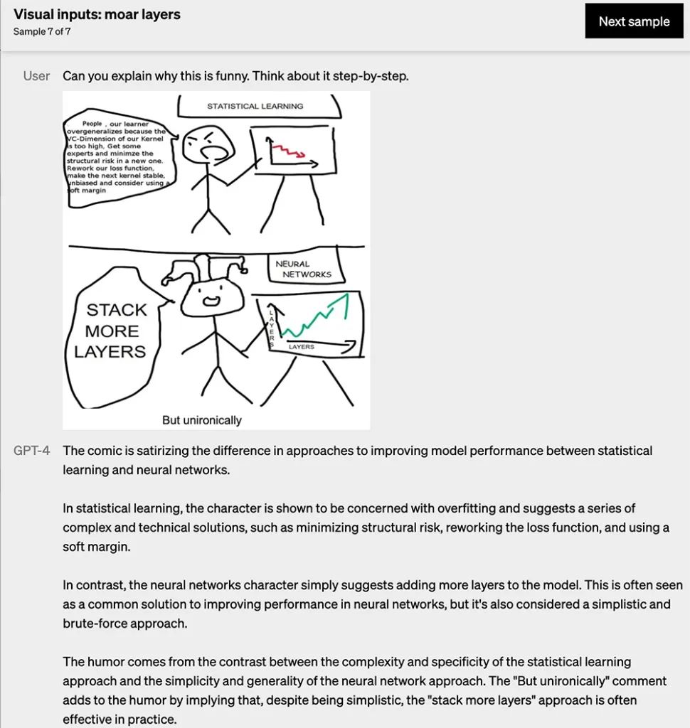 最后一个示例是让GPT-4解释这张漫画,GPT-4认为它讽刺了统计学习和神经网络在提高模型性能方面的差异。