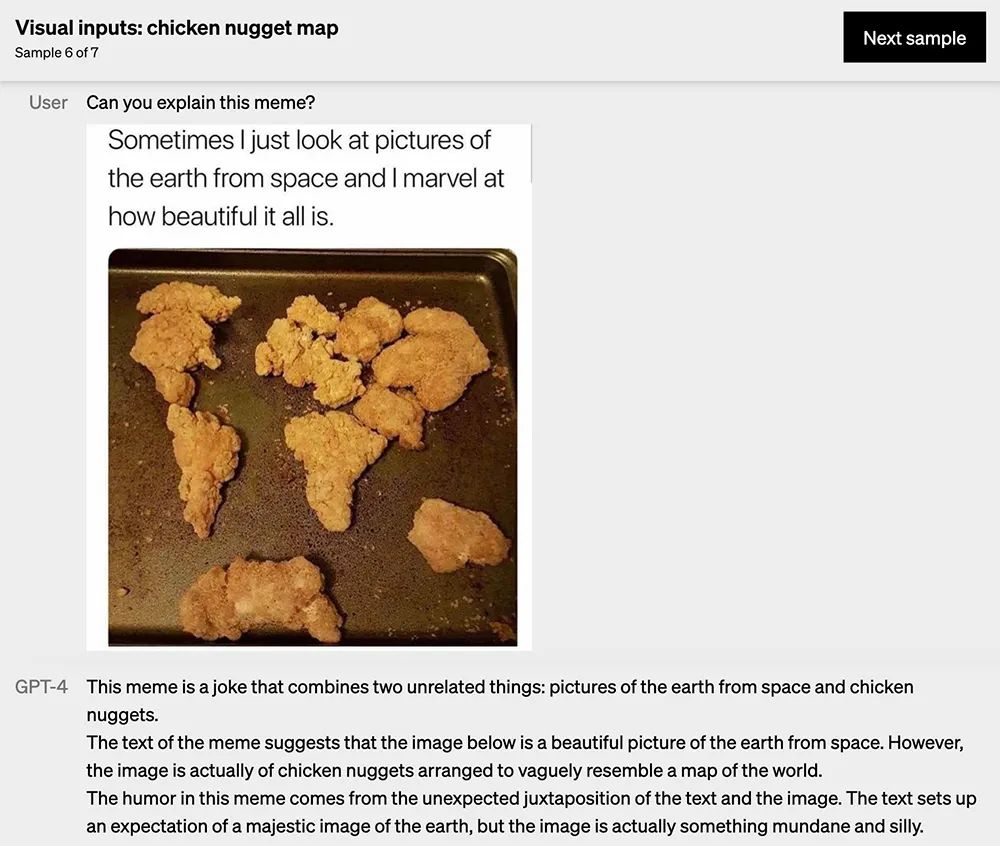 让GPT-4解释图中的模因(meme),GPT-4回答说这是个笑话,结合了太空中的地球照片和鸡块这两个不相关的东西。