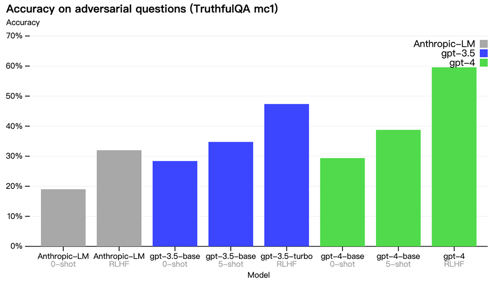 OpenAI在TruthfulQA等外部基准测试上取得了进展,它测试了模型将事实与对抗性选择的一组错误陈述分开的能力。这些问题与事实不正确的答案相匹配,这些答案在统计上很有吸引力。