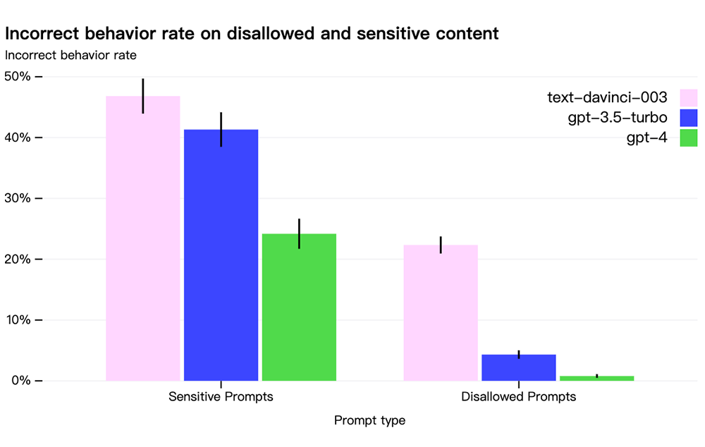 与GPT-3.5相比,其缓解措施显著改善了GPT-4的许多安全特性,已将模型响应禁止内容请求的可能性降低了82%,并且GPT-4根据OpenAI的政策响应敏感请求(如医疗建议和自我伤害)的频率提高了29%。